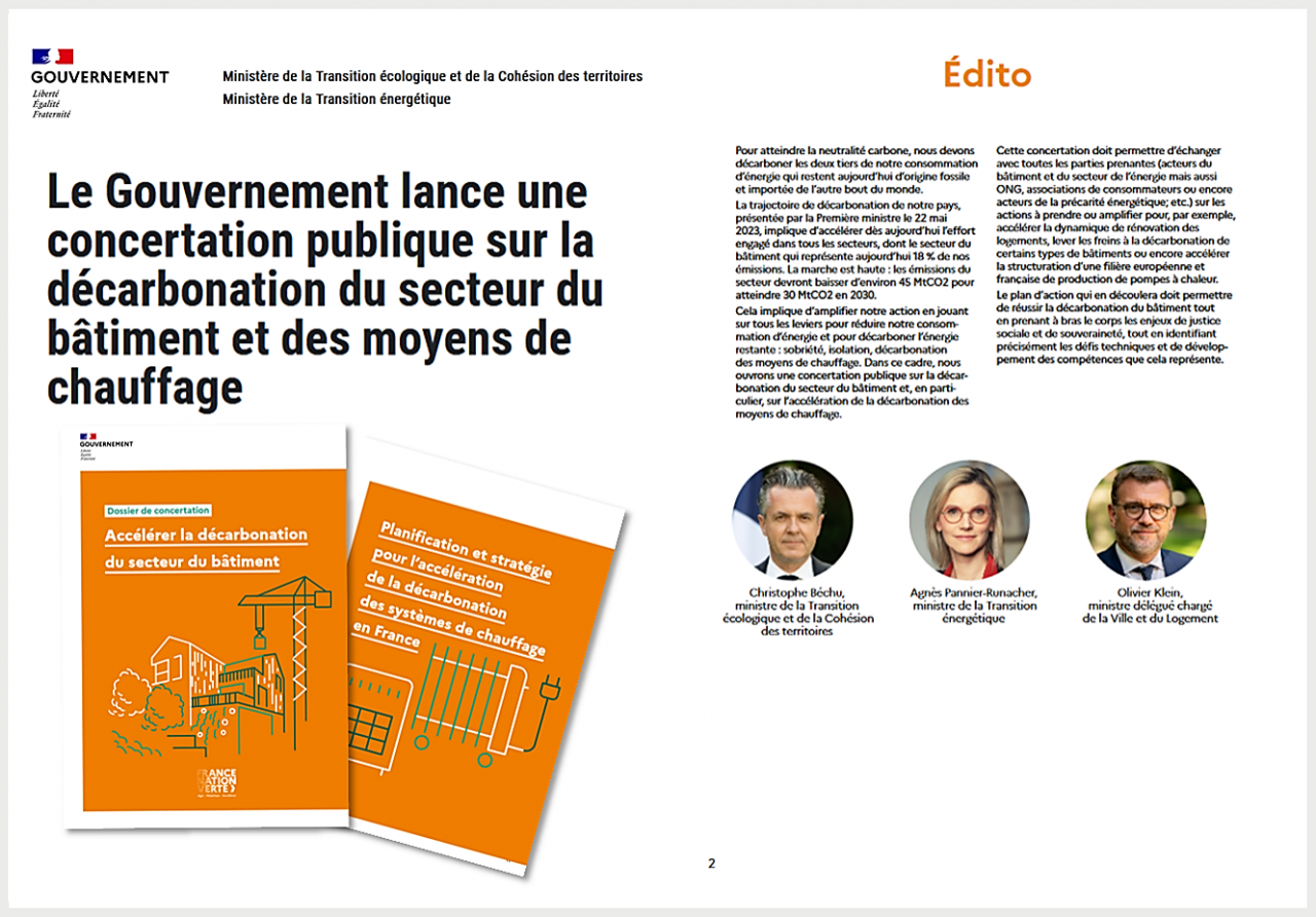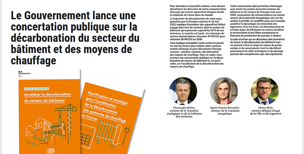 Dans le cadre des travaux de planification écologique pilotés par la Première ministre Elisabeth Borne, le Gouvernement lance une concertation publique sur la décarbonation du secteur du bâtiment et, en particulier, sur l'accélération de la décarbonation des moyens de chauffage dans le bâtiment. Elle se déroulera du 5 juin au 28 juillet 2023.