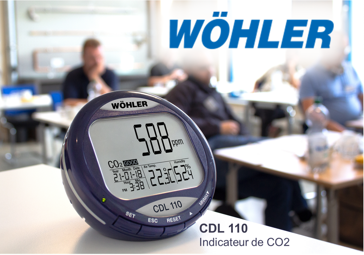L’indicateur de CO2 CDL 110 de Wöhler affiche à tout moment, et avec précision, la qualité de l'air à l'intérieur. Cet appareil mesure la teneur en CO2, ainsi que la température et l'humidité de l'air intérieur. Il fournit sur cette base une évaluation exacte de la qualité de l'air intérieur.