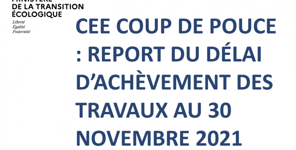 Le ministère de la Transition écologique vient d’annoncer hier soir (Source : Batiactu/AFP) le report du délai d’achèvement des travaux « Coups de pouce CEE » du 30 septembre au 30 novembre 2021 (pour les devis signés avant le 1er juillet 2021).
