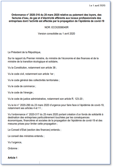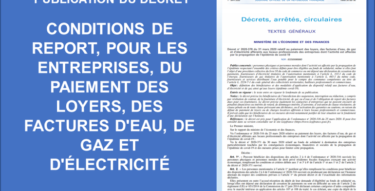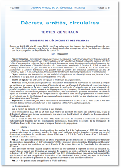 A été publié ce jour au Journal officiel le décret n° 2020-378 du 31 mars 2020 relatif à la définition des bénéficiaires et des modalités d'application du dispositif relatif aux factures d'eau, d'électricité et de gaz ainsi qu'aux loyers. Ce décret est pris pour mettre en application l'Ordonnance ci-dessous.