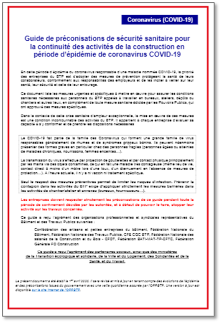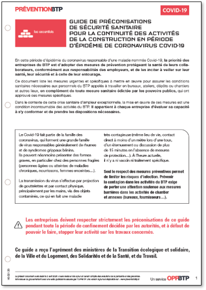 C'est après un long travail de concertation, auquel a participé le SYNASAV, que l'OPP-BTP vient de publier le "Guide de préconisations de sécurité sanitaire pour la continuité des activités" réalisé avec le soutien de médecins du travail et de préventeurs. Il a reçu l’AGRÉMENT DES MINISTÈRES de la Transition écologique et solidaire, de la Ville et du Logement, des Solidarités et de LA SANTÉ, et DU TRAVAIL.