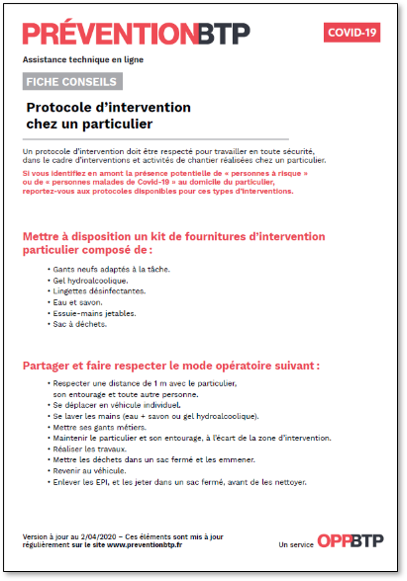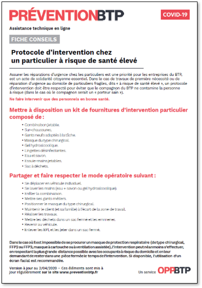 COVID-19 : Publication du Guide officiel des préconisations de sécurité sanitaires OPP-BTP - Téléchargez les protocoles d'interventions chez les particuliers.