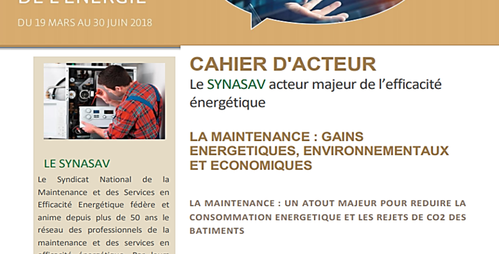 Dans ce cadre, le SYNASAV réaffirme l'indispensable prise en compte de la mise en service, de la maintenance et de l'entretien des appareils de chauffage et de ventilation dans les réflexions liées aux objectifs de la Loi de transition énergétique pour la croissance verte.