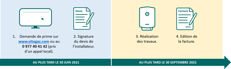 Attention ! Cette prime arrive à expiration. Pour que votre client la reçoive, il doit impérativement avoir signé votre devis au plus tard le 30 juin 2021 et avoir une facture datée au plus tard le 30 septembre 2021.