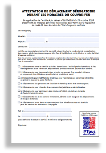 Attestation de déplacement dérogatoire durant les horaires du couvre-feu