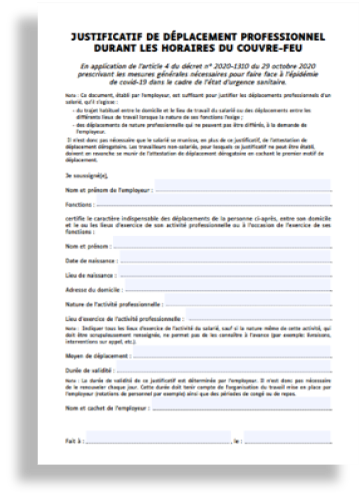 Justificatif de déplacement professionnel durant les horaires du couvre-feu