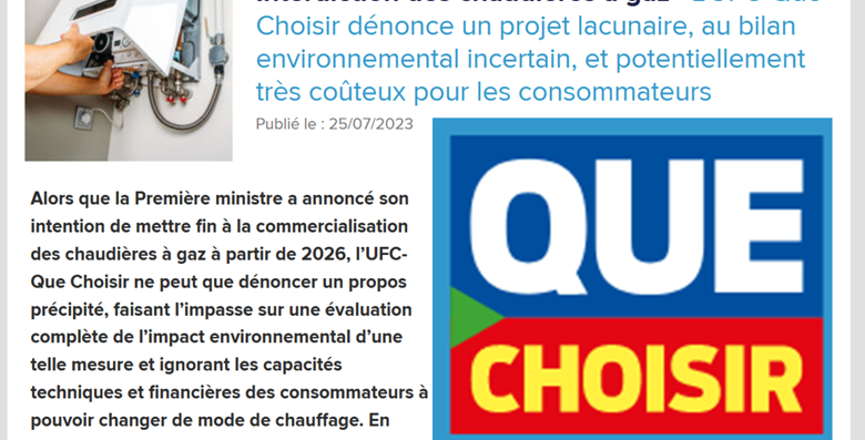 Interdiction des chaudières à gaz : L’UFC-Que Choisir dénonce un projet lacunaire !