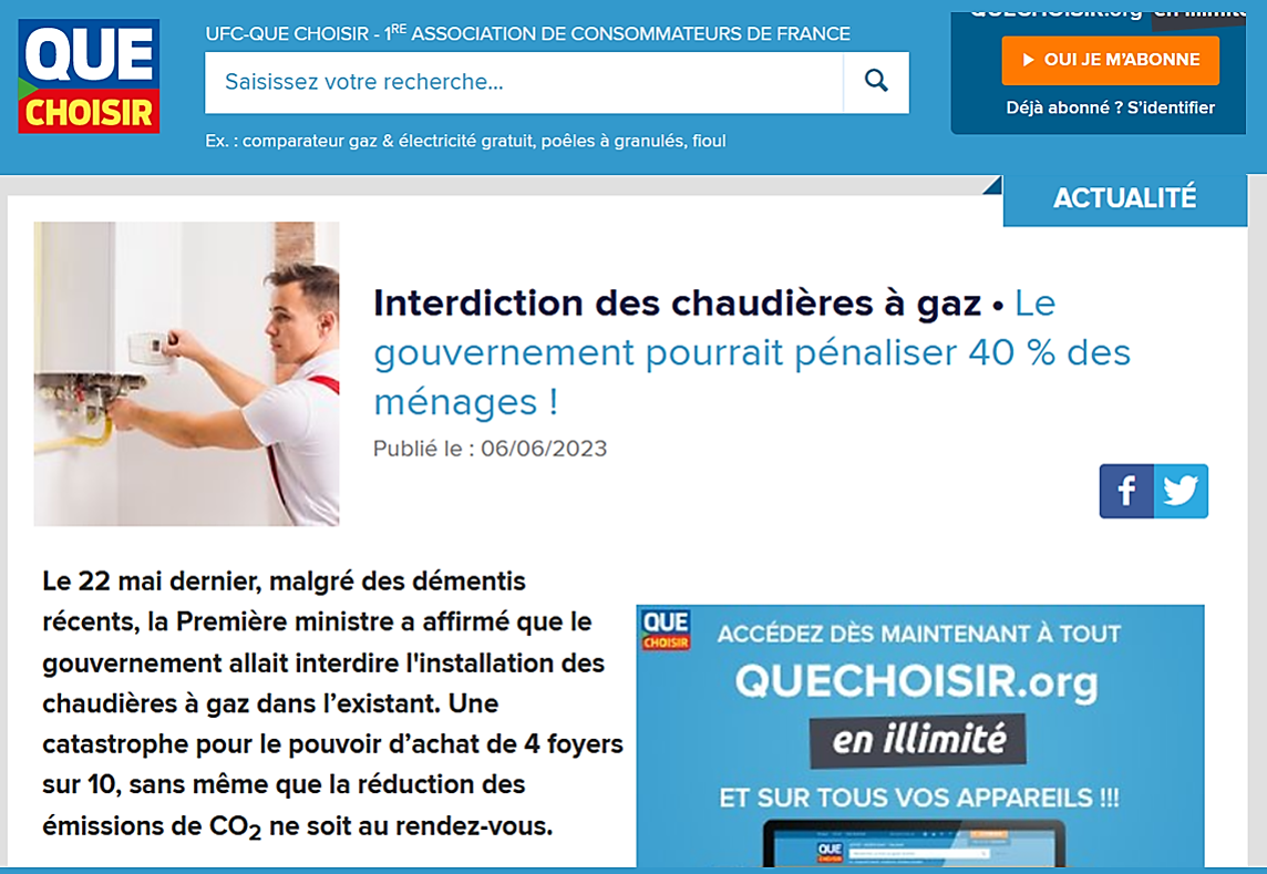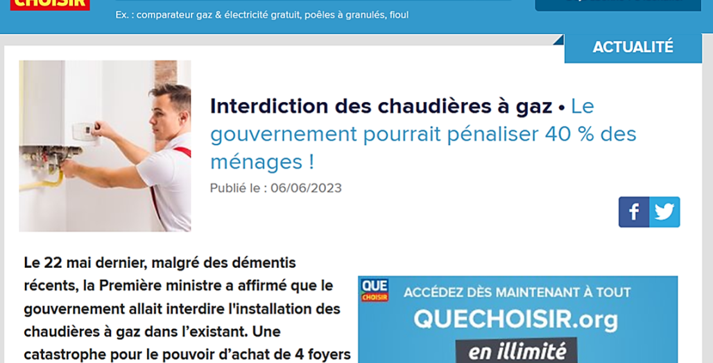 La 1ère association de consommateurs de France UFC QUE CHOISIR alerte : "Avec l'éventuelle interdiction des chaudières à gaz en remplacement d'appareil, le gouvernement pourrait pénaliser 40 % des ménages !"