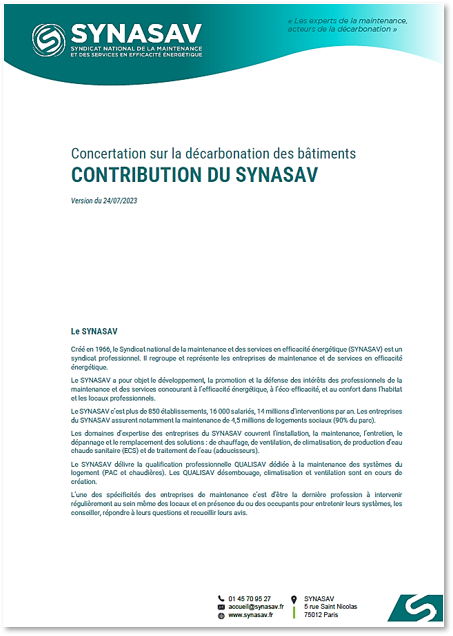Dans le cadre des travaux de planification écologique pilotés par la Première ministre Élisabeth Borne, le Gouvernement a lancé une concertation publique sur la décarbonation du secteur du bâtiment du 5 juin au 28 juillet 2023. C'est donc dans un temps imparti très court, que le SYNASAV, par le biais de son Conseil d'administration, a du affuter ses arguments pour rappeler de nombreuses évidences et vérités trop vites oubliées et qui pourtant sont essentielles dans notre lutte commune contre le réchauffement climatique.