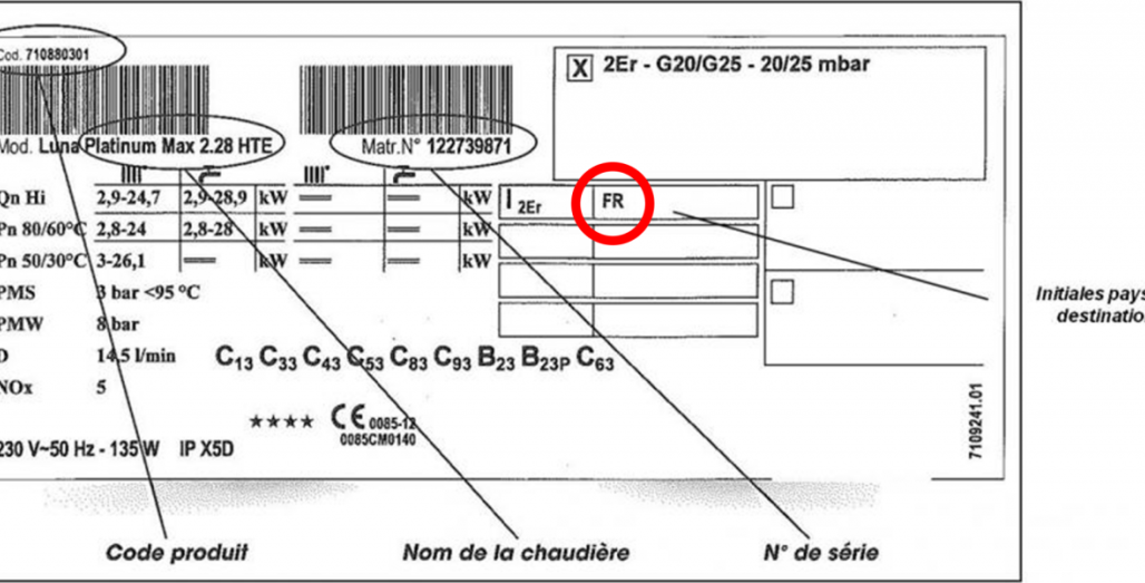 Uniquement À CONDITION que l’appareil soit destiné à être utilisé sur le marché français et donc, à ce titre en plus du marquage "CE" l’appareil devra avoir la mention "FR". Ces informations devront être indiquées sur la plaque signalétique de l’appareil comme ci-après. Ce marquage garantit que l’appareil est prévu pour s’adapter aux installations françaises (type de gaz, type de raccordement...).