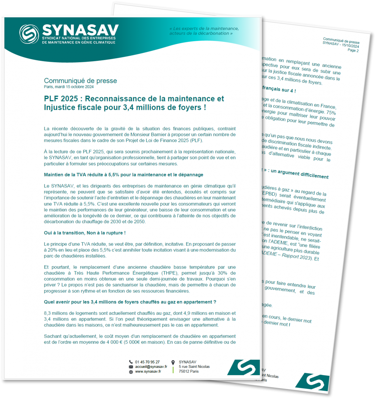 L’Observatoire SYNASAV – BVA de juin 2024 du chauffage et de la climatisation en France, a permis de mesurer le lien direct entre le pouvoir d’achat et la consommation d’énergie. 75% des français déclarent suivre leurs consommations d’énergie pour maîtriser leur pouvoir d’achat. 25% d’entre eux annoncent que c’est même une obligation pour leur permettre de « boucler la fin du mois ». De la fragilité économique à la précarité énergétique, il n’y a qu’un pas que nous nous devons de refuser de franchir. Nous nous opposons à cette forme de discrimination fiscale indirecte. Il faut maintenir la TVA à 5,5% pour le remplacement de chaudière et en particulier à chaque fois que techniquement ou juridiquement il n’y a pas d’alternative viable pour le consommateur.