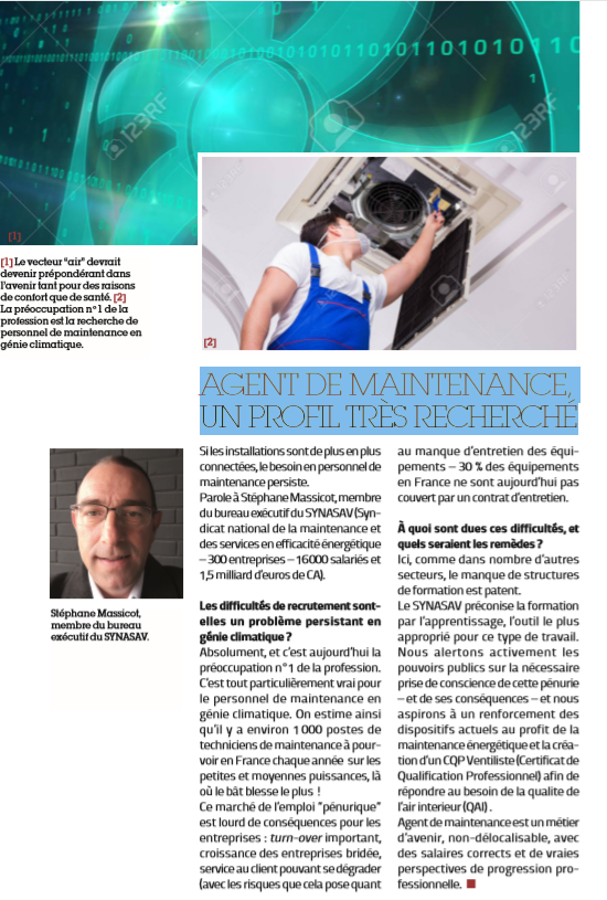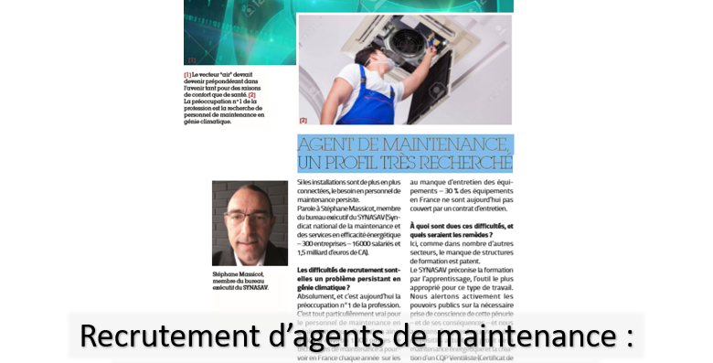 Interviewé par le magazine l'Usine Nouvelle, Stéphane MASSICOT rappelle que la profession est en permanence à la recherche d’agents de maintenance, environ 1000 postes sont à pourvoir en France chaque année.
