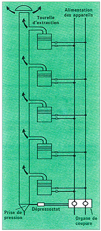 - Un dépressostat installé à la base du conduit détecte une chute de dépression régnant dans le conduit et générée par l’arrêt de l’extracteur.